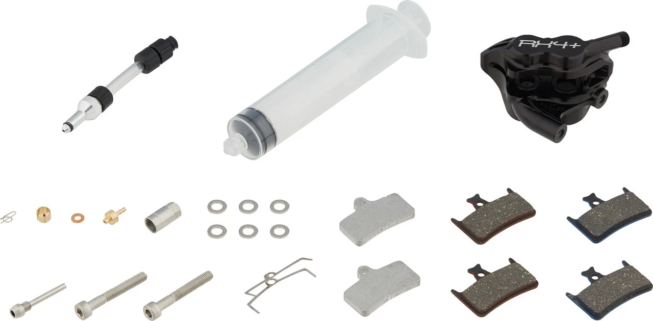 1 x Bremssattel Hope RX4+ FM +20 für SRAM Hinterrad1 Paar Bremsbeläge Hope blau für Road1 Paar Bremsbeläge Hope rot für Cyclocross / Gravel2 x Befestigungsschraube1 x R-Clip6 x Unterlegscheibe1 x Belaghalteschraube1 x Rückstellfeder1 x Olive1 x Insertpin1 x Überwurfmutter1 x Unterlegscheibe Kupfer1 x Spritze1 x Schlauch mit Adapter2 x Entlüftungsblock