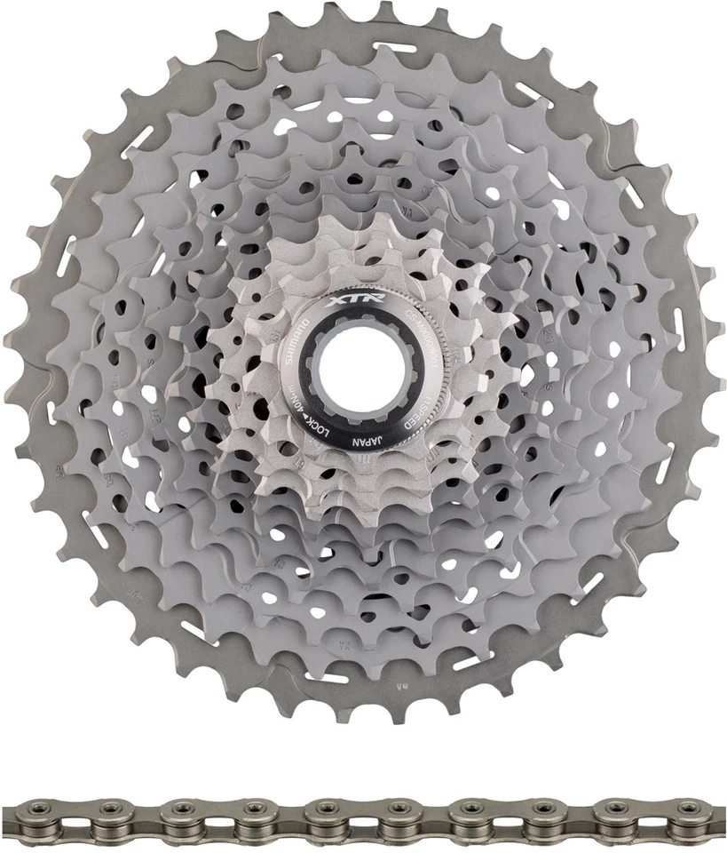 Spezifikationen:Serie:XTR Di2 M9050Einsatzbereich:Cross Country, All Mountain, EnduroSchaltung:11-fach (elektrisch)Kabelverlegung:internAkku-Montage:internFunkprotokoll:ANT private, Bluetooth® LE (wireless/kabellos)Technische Daten Kassette:Typ:XTR CS-M9001 (HG)Schaltstufen:11-fachAbstufung:11-40 Z (11-13-15-17-19-21-24-27-31-35-40 Z)Material Ritzel:Stahl (Ritzel 1 bis 4), Titan (Ritzel 5 bis 10), Aluminium (Ritzel 11)Freilaufkompatibilität:Shimano MTBHinweis:mit 1,85 mm Distanzring kompatibel zu Shimano Road 11-fachSpider / Ritzelträger:4 (2 x Aluminium, 2 x Carbon)Technische Daten Schaltwerk:Typ:XTR Di2 RD-M9050 kurz/mittellang (GS)Befestigung:Standard (Direct Mount kompatibel)Kapazität:35 ZähneMax. Zähne größtes Ritzel:42 Zähne bei 2×11-fach, 46 Zähne bei 1×11-fachMin. Zähne größtes Ritzel:40 ZähneMax. Zähne kleinstes Ritzel:11 ZähneMin. Zähne kleinstes Ritzel:11 ZähneMax. Differenz vorne:10 ZähneKompatibilität:Shimano MTB 11-fachKompatible Kette:HG-X11Schalträdchen:11 ZähneMaterial äuĂźerer Käfig:Carbon (CFRP)Material innerer Käfig:AluminiumMaterial weitere Bauteile:Edelstahl, Aluminium, Carbon (CFRP)Technische Daten Kette:Typ:XTR / Dura-Ace CN-HG901-11 (HG-X11)Gliederzahl:116Verschlussart:Kettenschloss (Quick-Link)Nietentyp:chrombeschichtet, hohlLaufrichtungsgebunden:JaMaterial:StahlTechnische Daten Schaltgriff:Typ:XTR Di2 SW-M9050 (Firebolt)Montage:Klemmschelle (geschlossen)Material Gehäuse:KunststoffMaterial Hebel:KunststoffEinstelloptionen:PositionseinstellungFeatures:2 Schalter, 1 E-Tube-Anschluss, Mehrfach-Input rechts: Hold, Mehrfach-Input links: kompatibel mit RD Multishift, Federung/Dämpfer Schalter: links Dämpfungskontrolle von FOX iRD Komponenten möglichTechnische Daten Display: nur bei Version mit Display