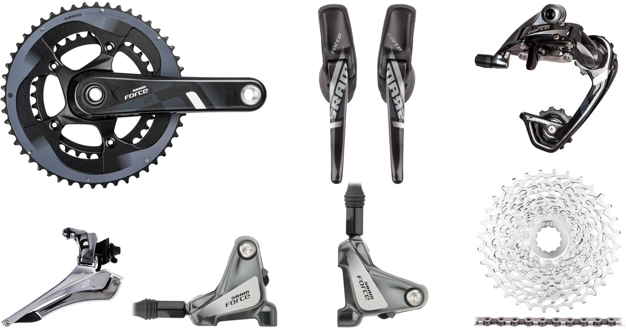 1 x Kurbelgarnitur SRAM Force 22 GXP1 x Schaltwerk SRAM Force 22, kurz oder mittel1 x Umwerfer SRAM Force 22 anlöt1 Paar Schalt-/Bremsgriffe SRAM Force 22 DoubleTap® 2-/11-fach1 Paar Scheibenbremsen SRAM Force 22 (Flat Mount), montagefertig befĂĽllt und entlĂĽftet1 x Kassette SRAM PG-11701 x Kette SRAM PC 1170ohne GXP-Innenlagerohne Centerline-Bremsscheibenohne Bremsenadapter