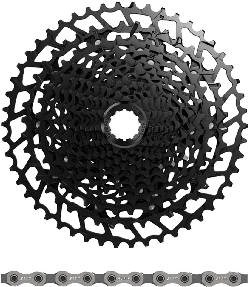 Abstufung: 11-13-15-17-19-22-25-28-32-36-42-50 ZHerstellernummer: 00.2418.086.000 (Kassette) + 00.2518.031.011 (Kette)Lieferumfang:1 x Kassette SRAM NX Eagle PG-1230 11-50 Z1 x Kette SRAM PC NX Eagleinkl. Kettenschloss
