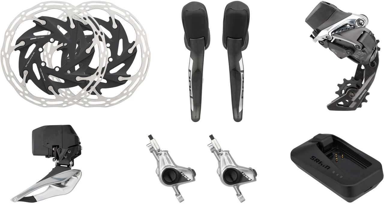 Lieferumfang:1 Paar Schalt-/Bremsgriffe SRAM Red eTap AXS HRD1 Paar Scheibenbremsen SRAM Red AXS (Postmount), montagefertig befüllt und entlüftet1 x Schaltwerk SRAM Red eTap AXS mit Akku1 x Umwerfer SRAM Red eTap AXS mit Akku2 x Bremsscheibe SRAM CLX, 6-Loch, 2-teilig 160 mm1 x Akkuladegerät1 x Kabel