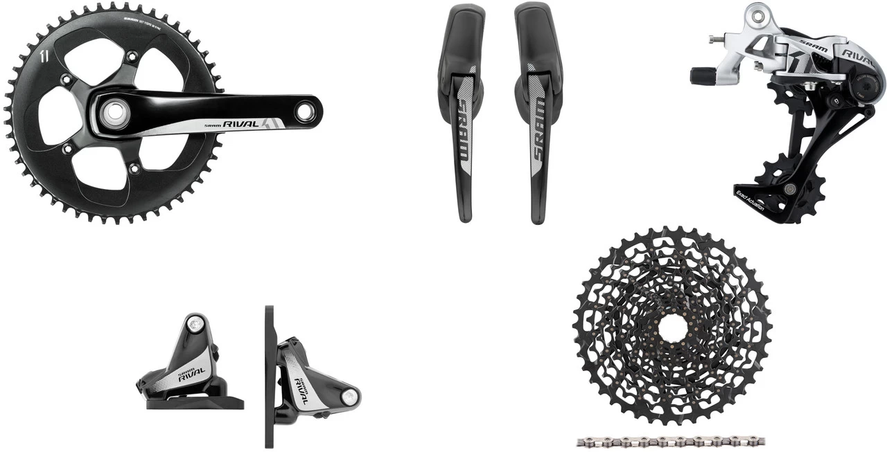 Spezifikationen:Serie:Rival 1Einsatzbereich:RoadSchaltung:11-fachBremsen:Disc, hydraulisch (Flat Mount)Komponenten:Kurbel:172,5 mm, 175,0 mm (50 Zähne)Kassette:10-42, 11-32, 11-36 ZSchaltwerk:langer KäfigKompatibilität:Shimano Freilauf (bei 11-36, 11-32)SRAM XD Freilauf (bei 10-42)Komplettierung:Das Innenlager ist im Lieferumfang nicht enthalten. SRAM empfiehlt GXP-Innenlager. Auch Centerline Bremsscheiben sind nicht im Lieferumfang enthalten.