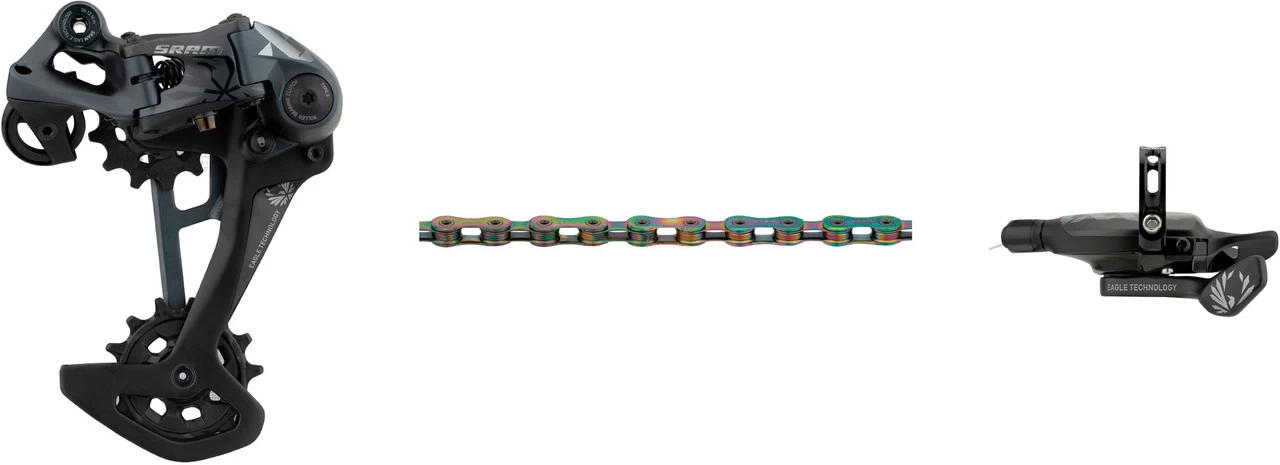 Dieses SRAM Upgrade-Kit der Serie XX1 Eagle fĂĽr 1×12-fach-Antriebe bietet leichte Schaltkomponenten mit Carbon fĂĽr Dein Cross-Country- oder All-Mountain-Bike. Es setzt sich zusammen aus einem XX1 Eagle Schaltwerk, passendem XX1 Eagle Trigger Schaltgriff und einer PC XX1 Eagle Kette.
