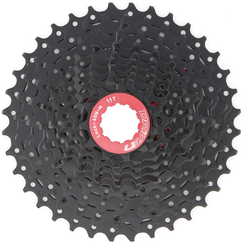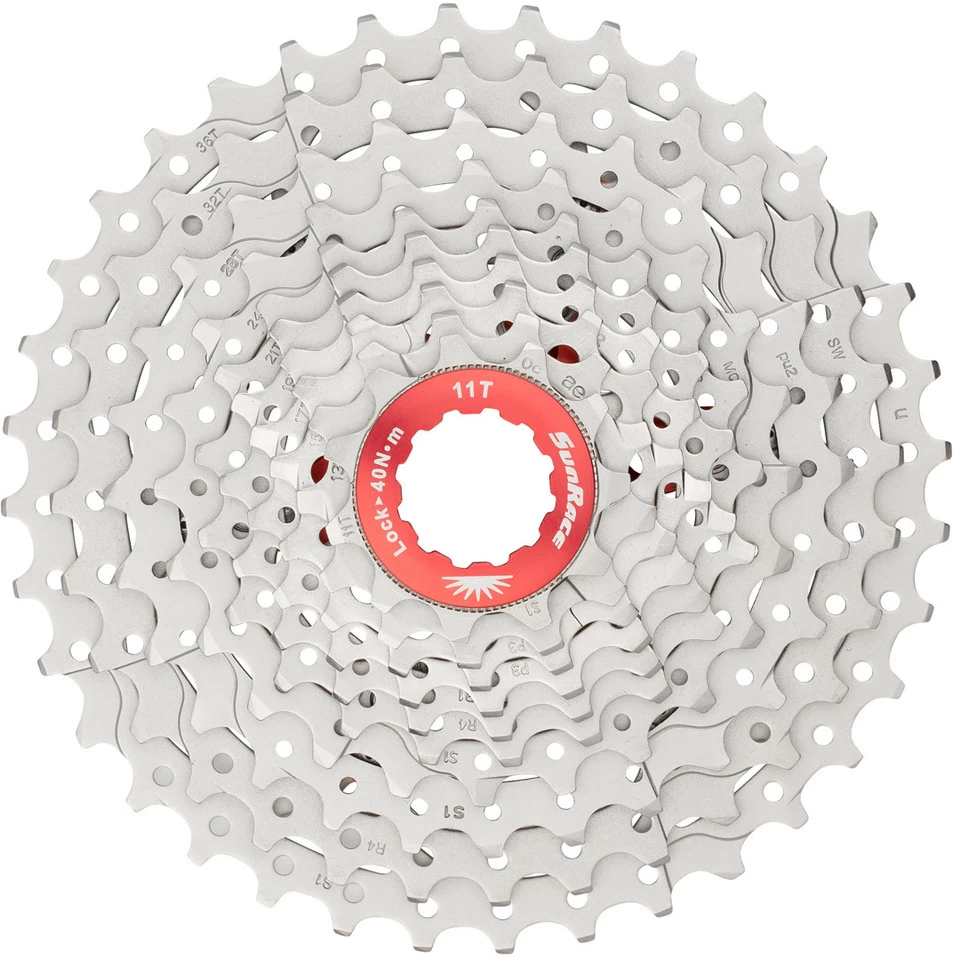 Bei der SunRace CSMX0 Kassette bestehen zwar alle 10 Ritzel aus Stahl, mittels lochartiger Ausstanzungen wird aber so gut es geht Gewicht gespart. Zusätzlich sorgt die Fluid Drive Plus™ Technologie genau wie bei den teureren Kassetten für zuverlässige und akkurate Schaltperformance. Zwei rot eloxierte Spider und der rote SunRace Lockring setzen farbige Akzente.